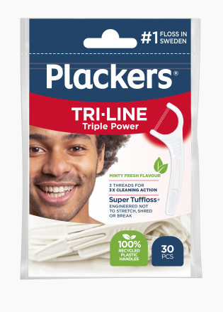 Plackers® Tri-line tandtrådsbygel med tre Tuffloss®-trådar med mintsmak rengör effektivt plack och matrester mellan tänderna.