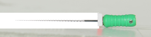 Steril rotkanalsfil enligt Hedström av rostfritt stål med filstopp och färgkodat skaft.