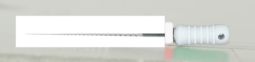 Steril rotkanalsfil enligt Hedström av rostfritt stål med filstopp och färgkodat skaft.