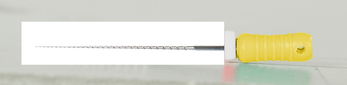 Steril rotkanalsfil enligt Hedström av rostfritt stål med filstopp och färgkodat skaft.