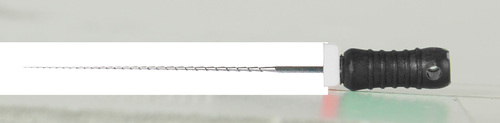 Steril rotkanalsfil enligt Hedström av rostfritt stål med filstopp och färgkodat skaft.