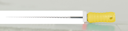 Steril rotkanalsfil enligt Hedström av rostfritt stål med filstopp och färgkodat skaft.