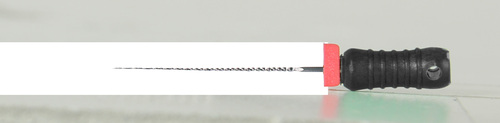 Steril K-fil av rostfritt stål med filstopp och färgkodat plastskaft.