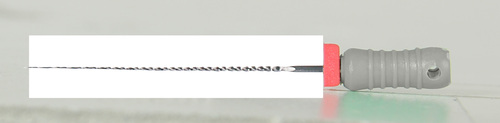 Steril K-fil av rostfritt stål med filstopp och färgkodat plastskaft.